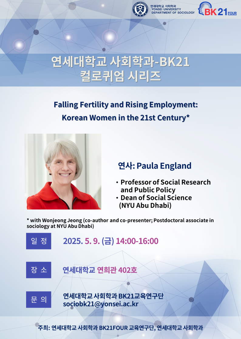 [SNU Sociology] [Yonsei Sociology] Colloquium - Professor Paula England : 5/8-9(Thu-Fri)